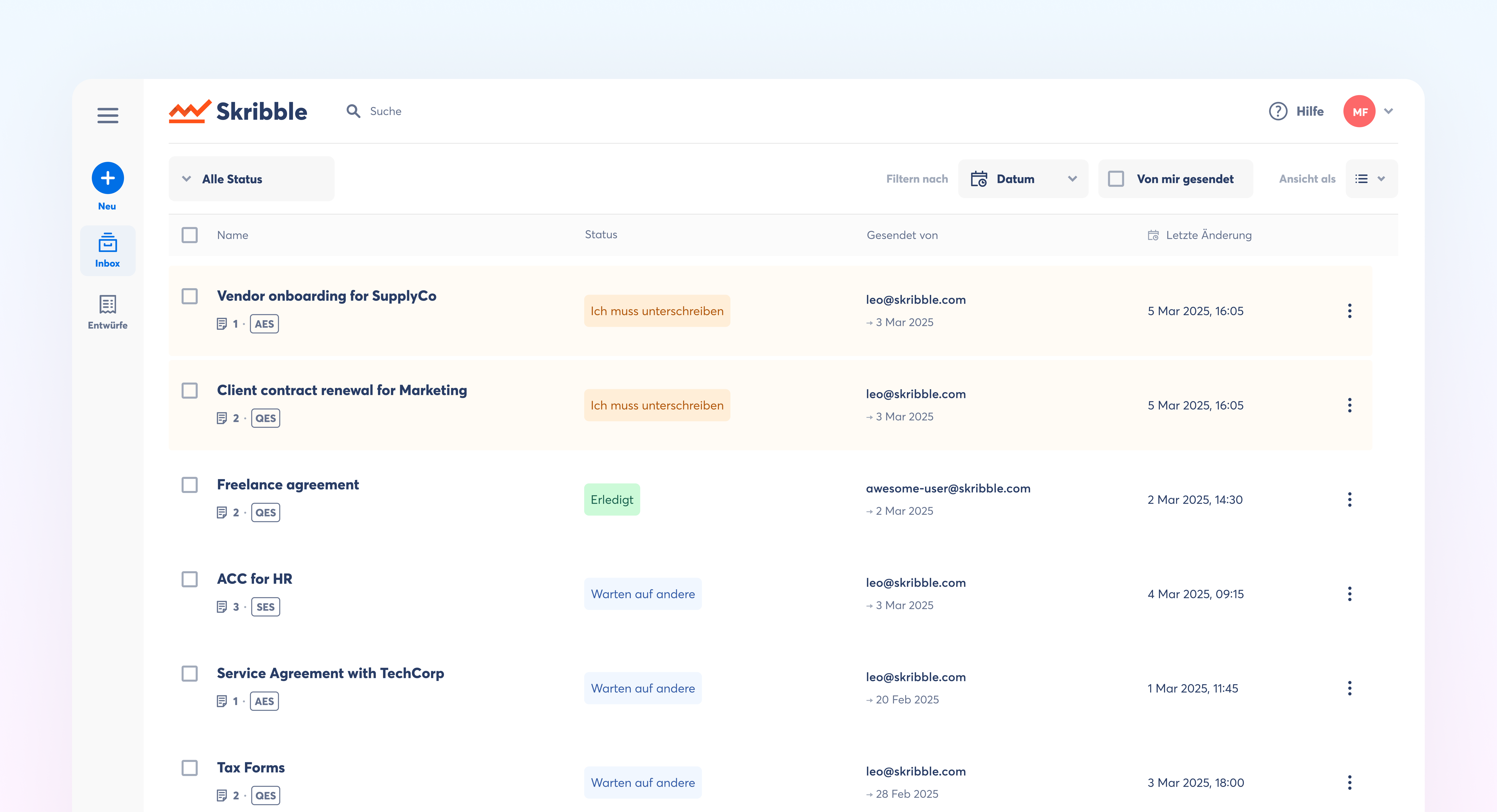 Finden Sie schneller, was wichtig ist. Unsere neue Inbox hilft Ihnen dabei, Signaturanfragen zu sortieren, zu filtern und zu verwalten, damit nichts verloren geht und Aktionen schneller erfolgen.